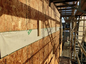 外部では屋根の下葺きを行っています。下葺き材としてゴムアスルーフィングを貼りました。