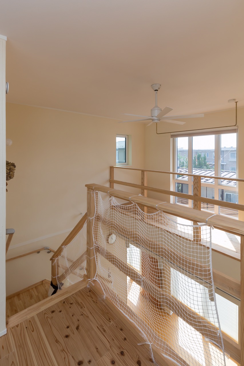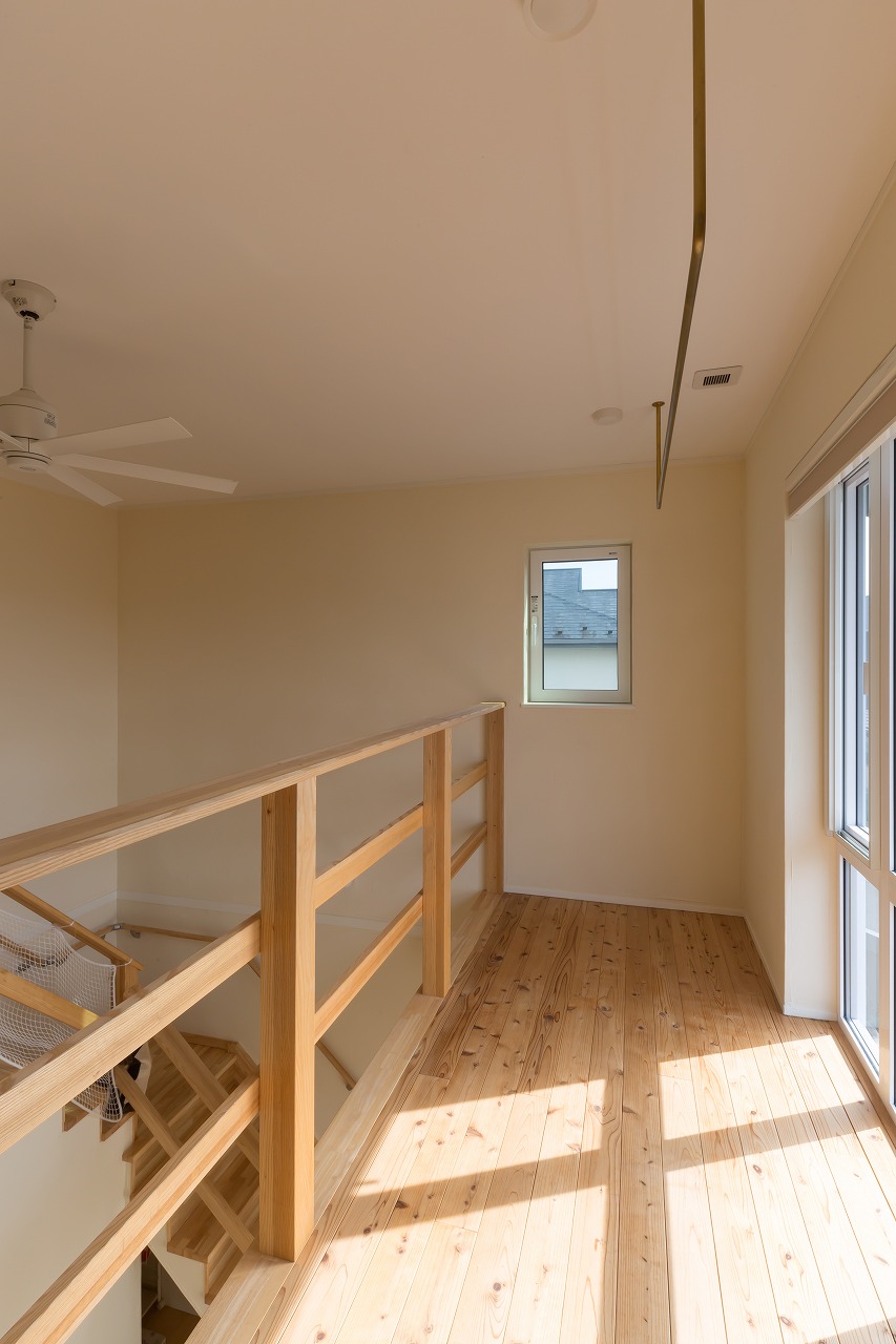 吹抜け面に面した二階の南側のサンルーム。床材は杉材です。物干しの金物は上手製作所さんの真鍮金物を採用。