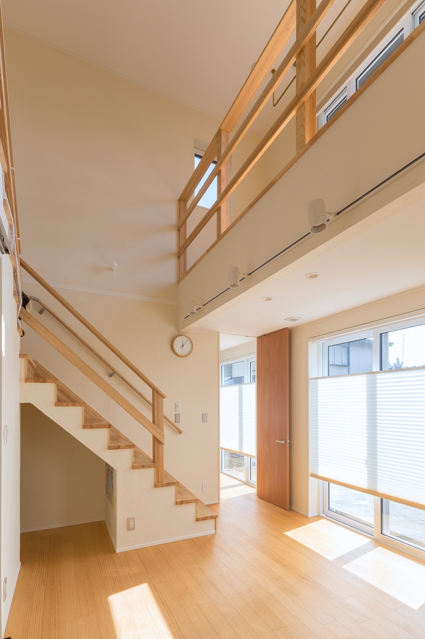 ダイナミックな吹抜けとリビング階段。化粧手摺りには木製バットと同じ素材のアッシュ材でシンプルなデザインで強度がある納まりにしました。 |