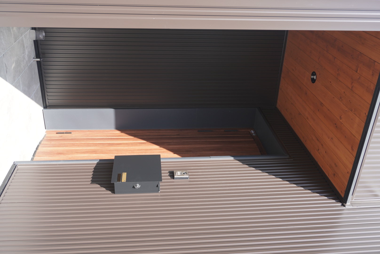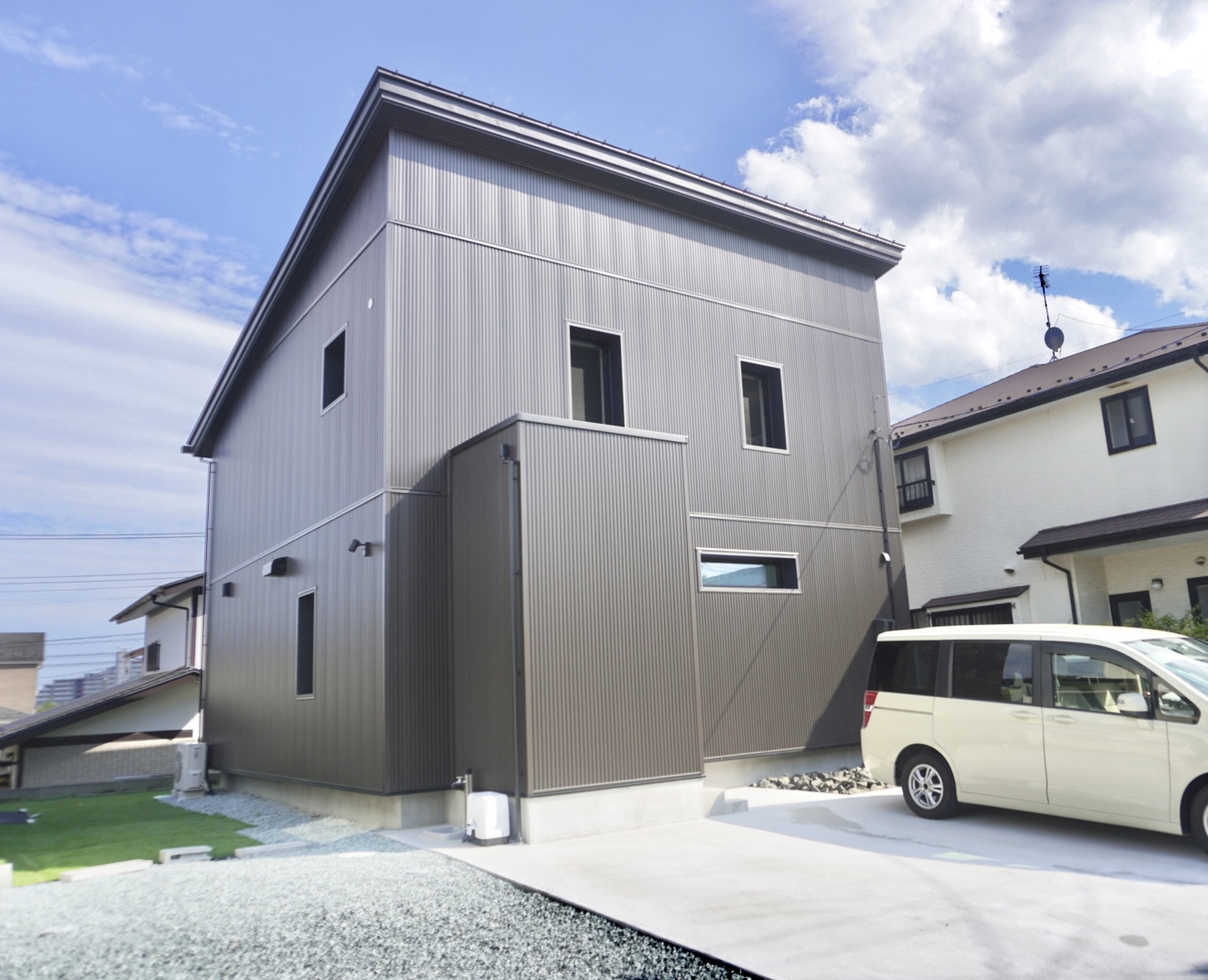 玄関ポーチの天井には杉材の羽目板を採用し、外観にアクセントをプラスしました。