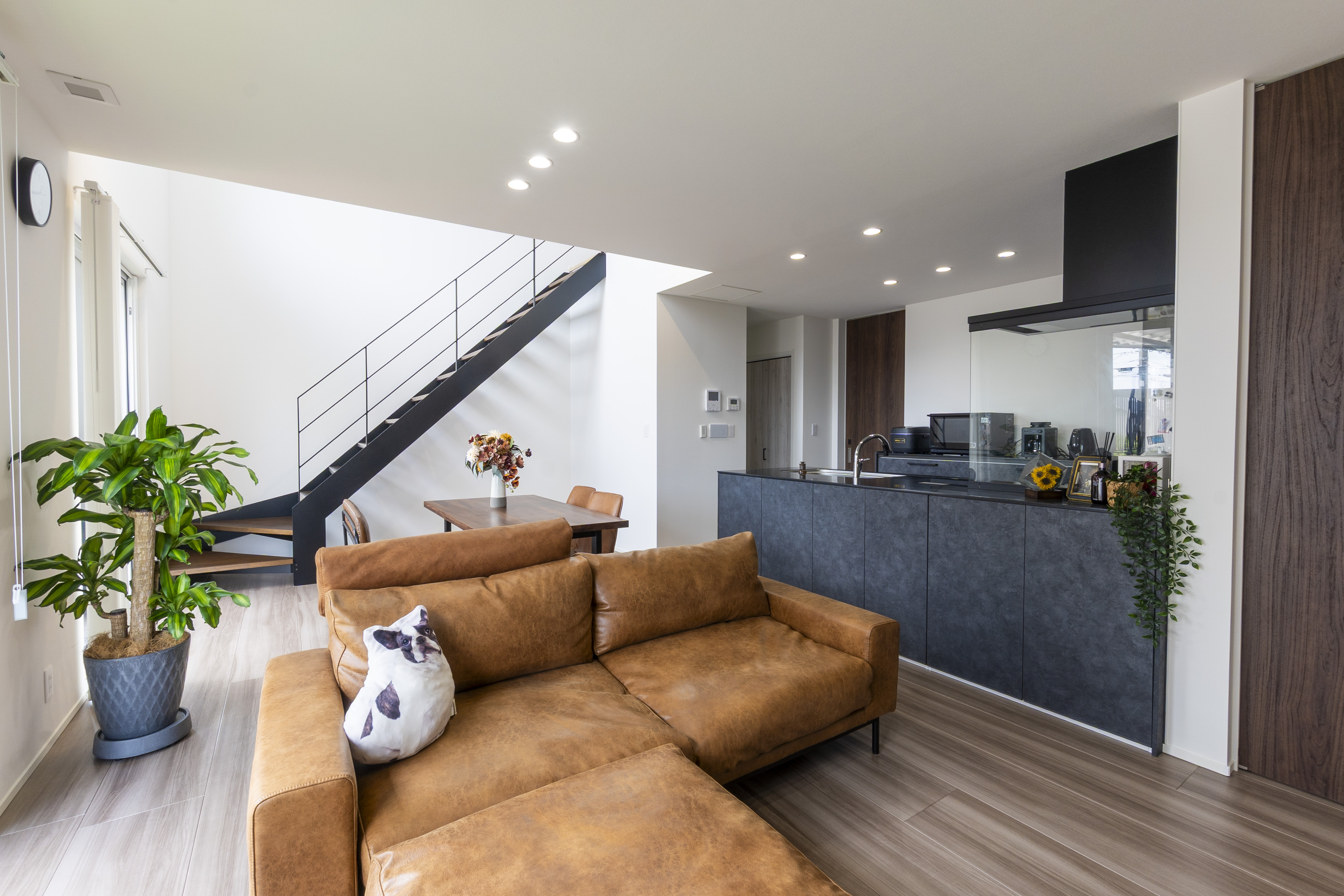 リビングに配置したアイアン階段と吹抜けが空間に広がりを演出します。ブラックの手摺と木の踏板がモダンでスタイリッシュな雰囲気を作り出しています。 |