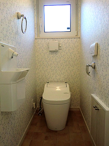 ブルーの花柄のクロスが涼やかな印象のカワイイトイレに仕上がりました。 |
