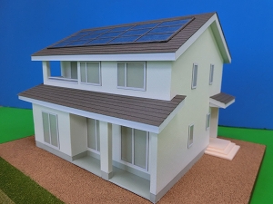 A様邸は南側に軒を深くした切妻屋根の外観デザインで太陽光発電システムを搭載しています。