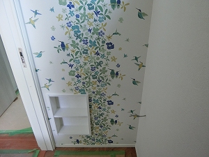 塗装工事の後は、クロス屋さんが下地ボードの継ぎ目などのパテ処理を行っています。パテ処理をしっかりと行うことで、表面のクロスが綺麗に仕上がります。