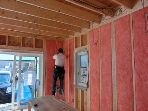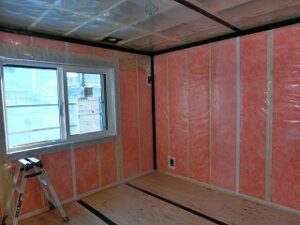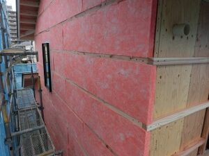 確認申請の中間検査では法令的な部分を中心にチェックして頂きました。お施主様とのコンセントやスイッチの確認の配線立ちも完了後に断熱工事をすすめています。