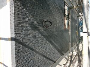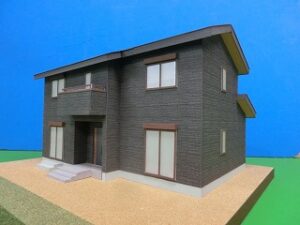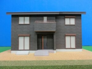 最終的には模型で決めていきます。K様邸ではネイビー色の外壁を採用しました。細かな石を散りばめた表面のデザインで陰影が変化します。均一なピッチの縦ラインが、建物にシャープな印象を与えています。