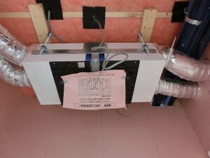 換気システムは鎌田工務店で標準採用しているローヤル電機(株)さんのSE200RSに成ります。ダクト式第一種熱交換換気を採用していて給気、排気を機械で強制的に行い、室内の汚れた空気を排出する際、熱を回収し外気から給気する新鮮な空気に熱を伝わらせることのできるシステムで熱交換率90%の高性能の換気システムに成ります。