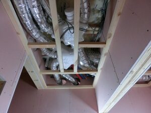 内部の石膏ボード張りもスタートしました。鎌田工務店では内装材の下地なる石膏ボードにホルムアルデヒドを短時間で吸収分解する性能のある、吉野石膏の「ハイクリンボード」を採用しています。