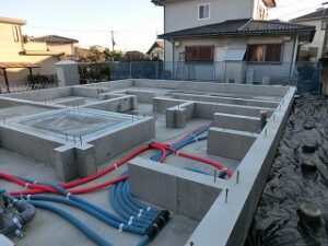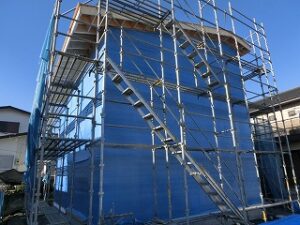 仙台市S様邸では建て方工事が完了しました。基礎工事が完了すると、水道の給排水工事を先行し、その後に現場に大工さんが入り建て方工事をスタートします。