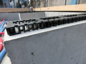 基礎の上部に設置する土台の材料は、圧注入材の防腐・防蟻処理のされた木材を採用してシロアリ対策をしています。 土台を基礎パッキンの通気部材の上に設置して基礎と土台を基礎にあらかじめ 設置したアンカーボルトと言う金物で連結します。 基礎の立上り部分の上に浴室や玄関の基礎断熱部分は気密用のパッキンや、 通気部分に成る外周部や内周部は通気用の基礎パッキンと使い分けています。