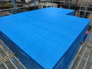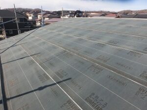 冬季休業期間に入る前に、屋根の下葺きルーフィングの施工が完了したので屋根や壁の濡れるリスクが減りました。一般的に建て方時の雨養生は軽視されがちですが、建て方時の雨養生をきちんと行わないと、初期型結露リスクが高まります。建て方時から、ブルーシートなどを準備し、一日の作業完了時には養生を行っています。
