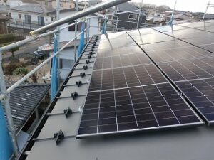 アイジー工業さんのSP-ビレクトは、美+rect(まっすぐな)“美しい直線”と命名された外壁で、その名の通り美しい水平ラインが特徴の唯一無二の金属外壁です。金属の質感を生かしたデザインと、その機能性からグッドデザイン賞も受賞しております。そして、金属サイディングは軽量で窯業系サイディングの約1/4、モルタル外壁の約1/10程度の重さです。軽量なため、建物の基礎や柱、壁などの重要な箇所に負担をかけないことから地震が発生しても影響を受けにくく、建物の倒壊リスクを回避することができます。 S様邸も許容応力度計算による耐震等級3を取得していますが、その計算の際も金属サイディングは軽い分、構造計算にも有利に成ります。↓の写真は、太陽光発電パネルの施工中の写真に成ります。Qセルズジャパン製を採用しました。屋根に穴をあけない工法で金具で受けてパネルを設置しています。