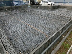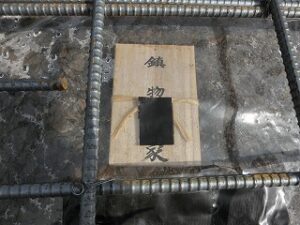 配筋が完了すると瑕疵保険の基礎配筋検査を受けます。W様邸も許容応力度計算による耐震等級3を取得しているので基礎配筋は複雑ですが、写真の様に丁寧な作業をしています。検査では配筋の結束が図面通りの施工か、配筋の太さや間隔など細かい部分にも間違いがないか確認してもらうのが配筋検査になります。指摘事項なしで合格しました。地鎮祭で預かっておりました「鎮め物」もこのタイミングで基礎の土中の中に鎮めさせていただいています。