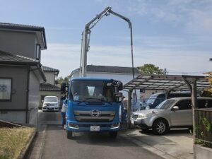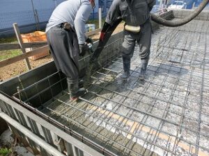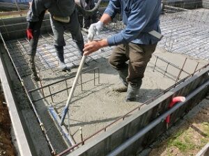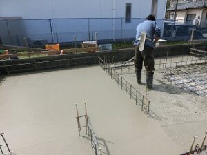 そして、配筋検査の後、土間部分の床面のコンクリートを打ち込みします。ポンプ車と言うコンクリートを圧送するホースの付いた特殊な車両で流し込んでそれを均していきます。この作業も専門のポンプ屋さんと言う業者さんが現場に入ります。その後、タンパーと言う道具を使ってコンクリート表面を叩いて締め固めます。こうすることで基礎の表面に沈めてひび割れを生じにくくします。さらにその後、コテと言う左官職人さんが使う道具で、綺麗に床面のスラブコンクリートをコテで押さえて表面を仕上げていきます。