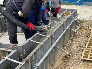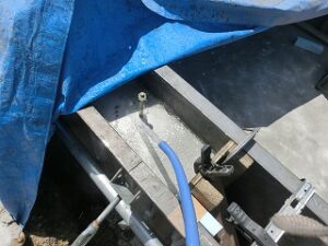 土間のコンクリートが固まると立ち上がり部分コンクリートの型枠を組んでから、立ち上がり部分のコンクリートを打設します。この時も、ポンプ車で型枠の中にコンクリートを流しこんでいきバイブレーターと言う機械で振動を与えます。コンクリートを均一に隅々までいき渡らせて中の空気も抜いていきます。散水してコンクリートを水で濡らして養生します。適切なタイミングの散水で水分の蒸発を防ぐことができます。