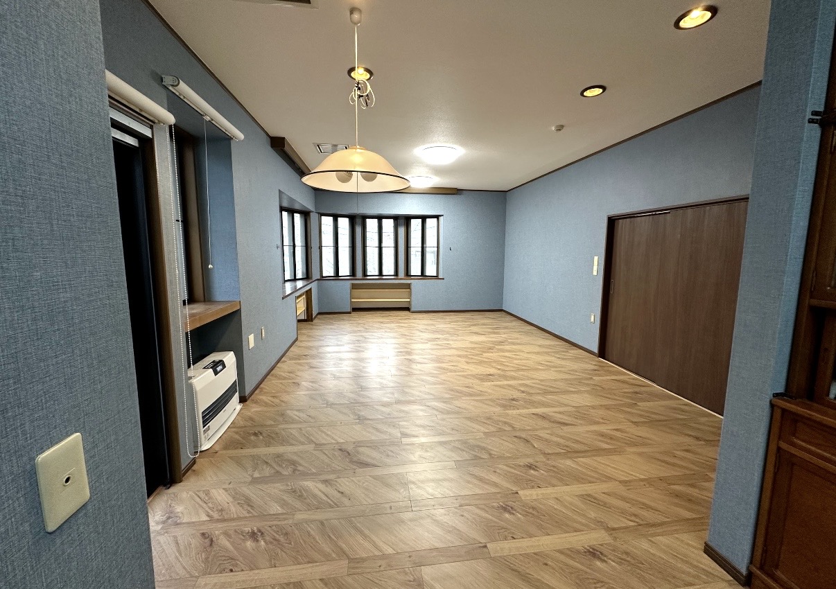 壁紙は落ち着きのあるブルー系クロスで仕上げ、木目フロアとの相性も抜群です。既存建具とのバランスも整え、統一感のある空間に生まれ変わりました。