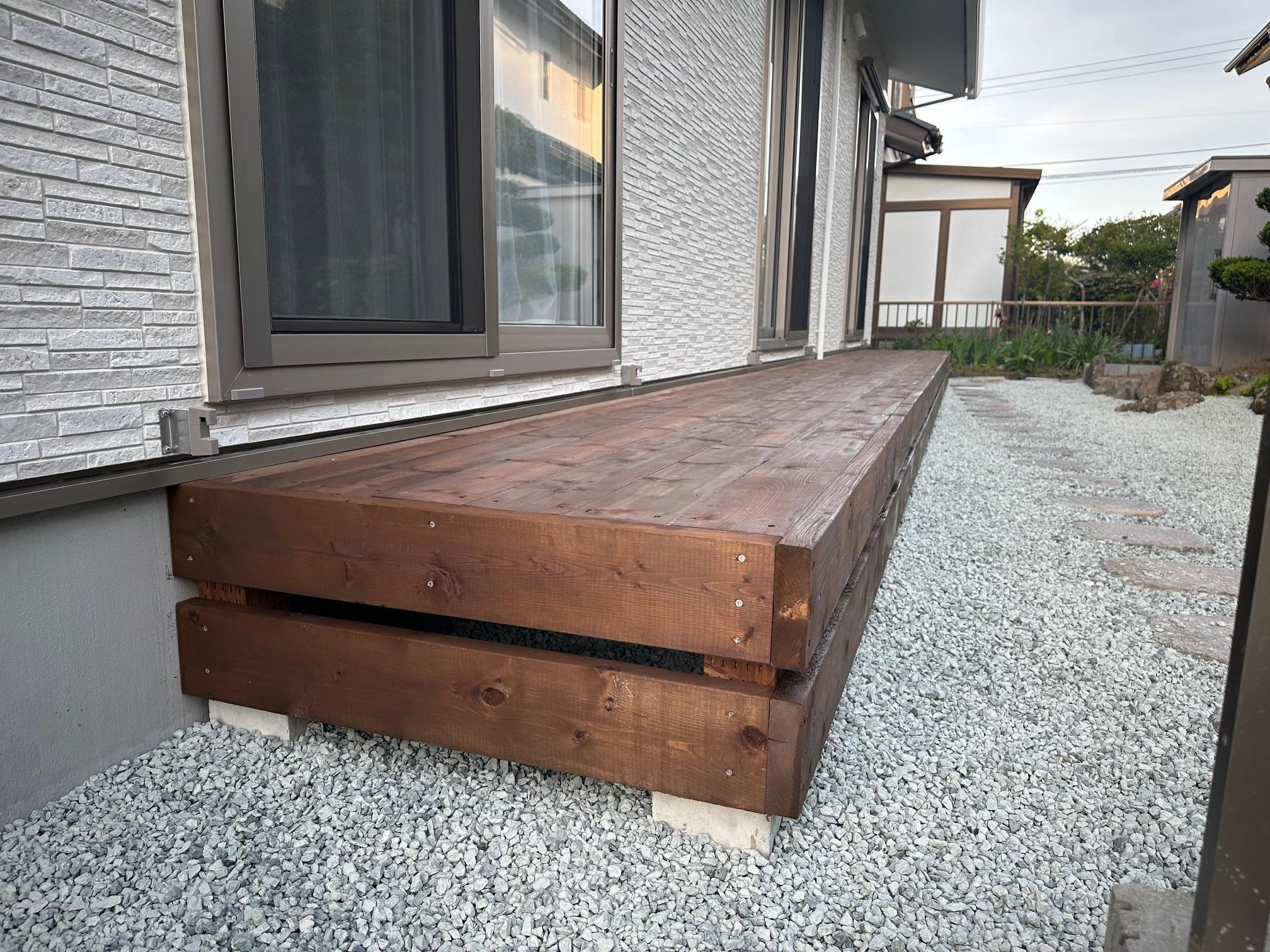 掃き出し窓からフラットに続く、ウッドデッキを施工させて頂きました。