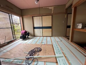 畳を撤去し、床組からやり替えました。下地施工後、断熱材をしっかりと充填し、断熱性能も向上させています。